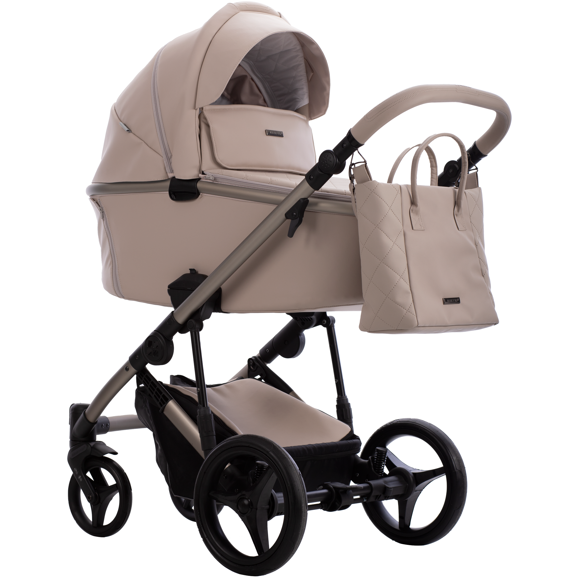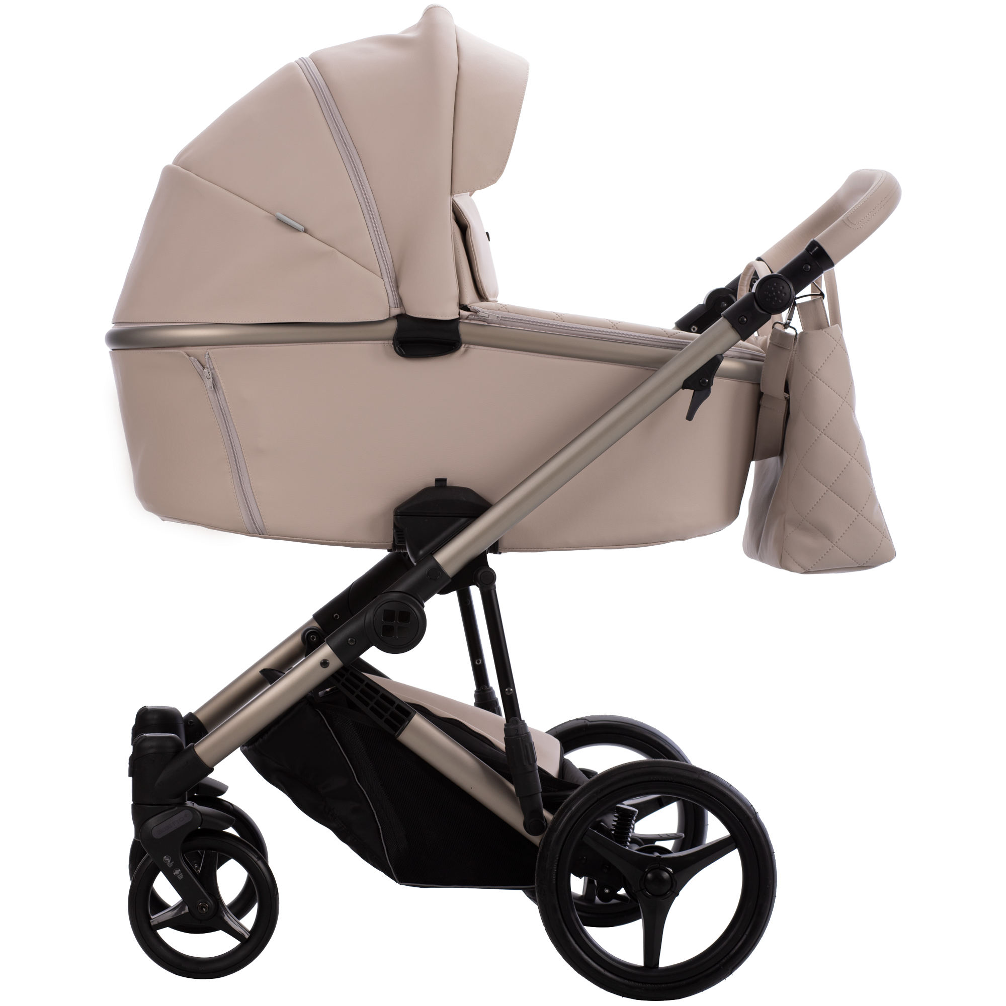 Stelaż jest wyposażony w koszyk zakupowy z wyjmowaną torbą, dostosowaną do koloru tapicerki wózka. To niezwykle wygodne zawsze wtedy, gdy chcesz zabrać więcej potrzebnych rzeczy na spacer z dzieckiem. Duża pojemność torby sprawia, że pomieścisz w niej także codzienne zakupy.