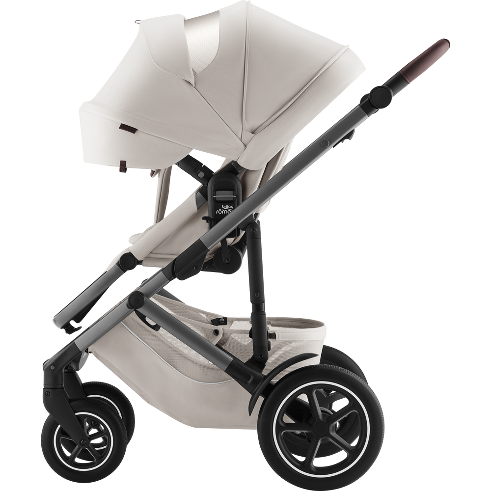 Wózek SMILE 5Z rośnie wraz z dzieckiem, zapewniając mu stale komfort. Dwa podnóżki – jeden na siedzisku i jeden na stelażu – pozwalają dziecku naturalnie oprzeć stopy, dzięki czemu może w pełni cieszyć się urokami przejażdżki
