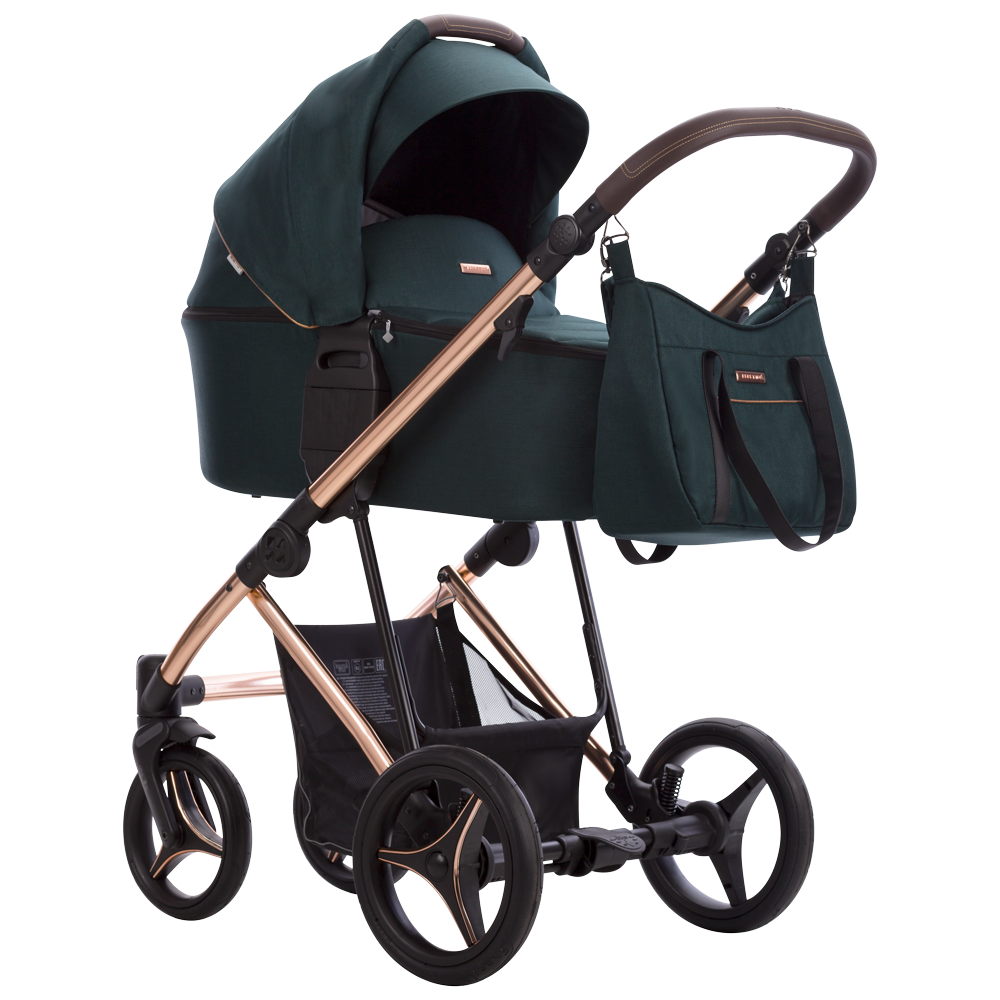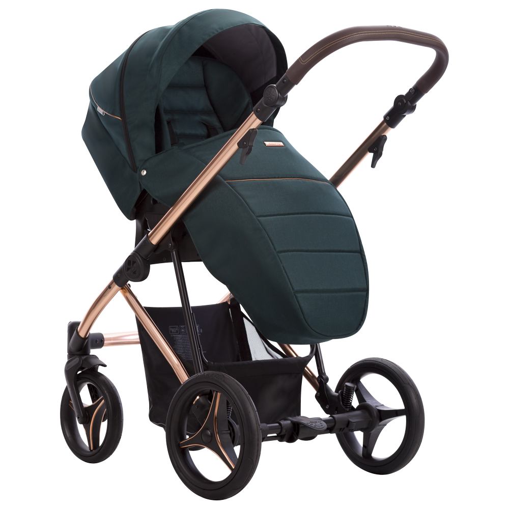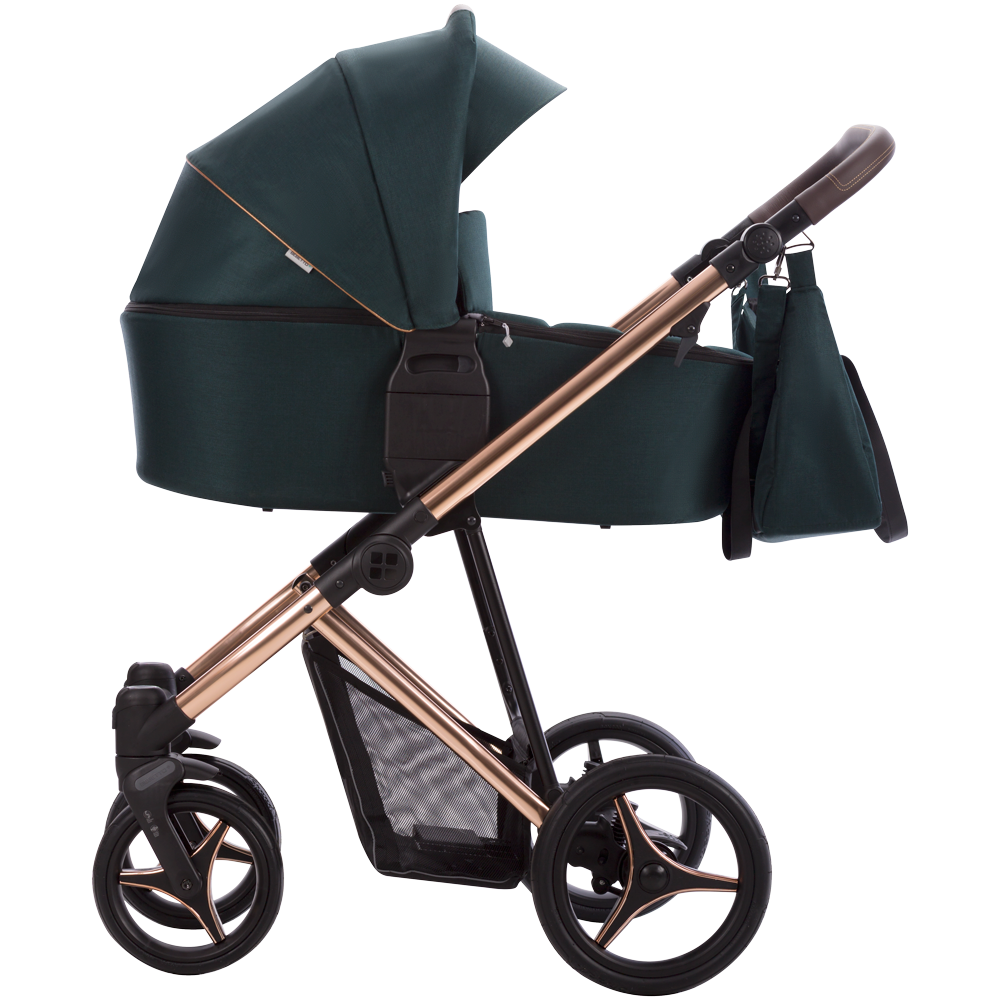 W wózku Flavio w wersji Premium Class oparty jest na konstrukcji STELLA, GOLD oraz SAND. A przeszycia na rączce w kolorze konstrukcji dodają uroku. Zastosowanie wąskich kół Flexy Wheels sprawia, że nie musisz pamiętać o kwestii ciśnienia w oponach, a jednocześnie możesz liczyć na komfortowe sterowanie wózkiem. Do złożenia stelaża wystarczy nacisnąć dwa przyciski po obu stronach konstrukcji i po prostu docisnąć górną część ramy. Obudowane elementy ruchome konstrukcji chronią przed przytrzaśnięciem palców podczas składania.