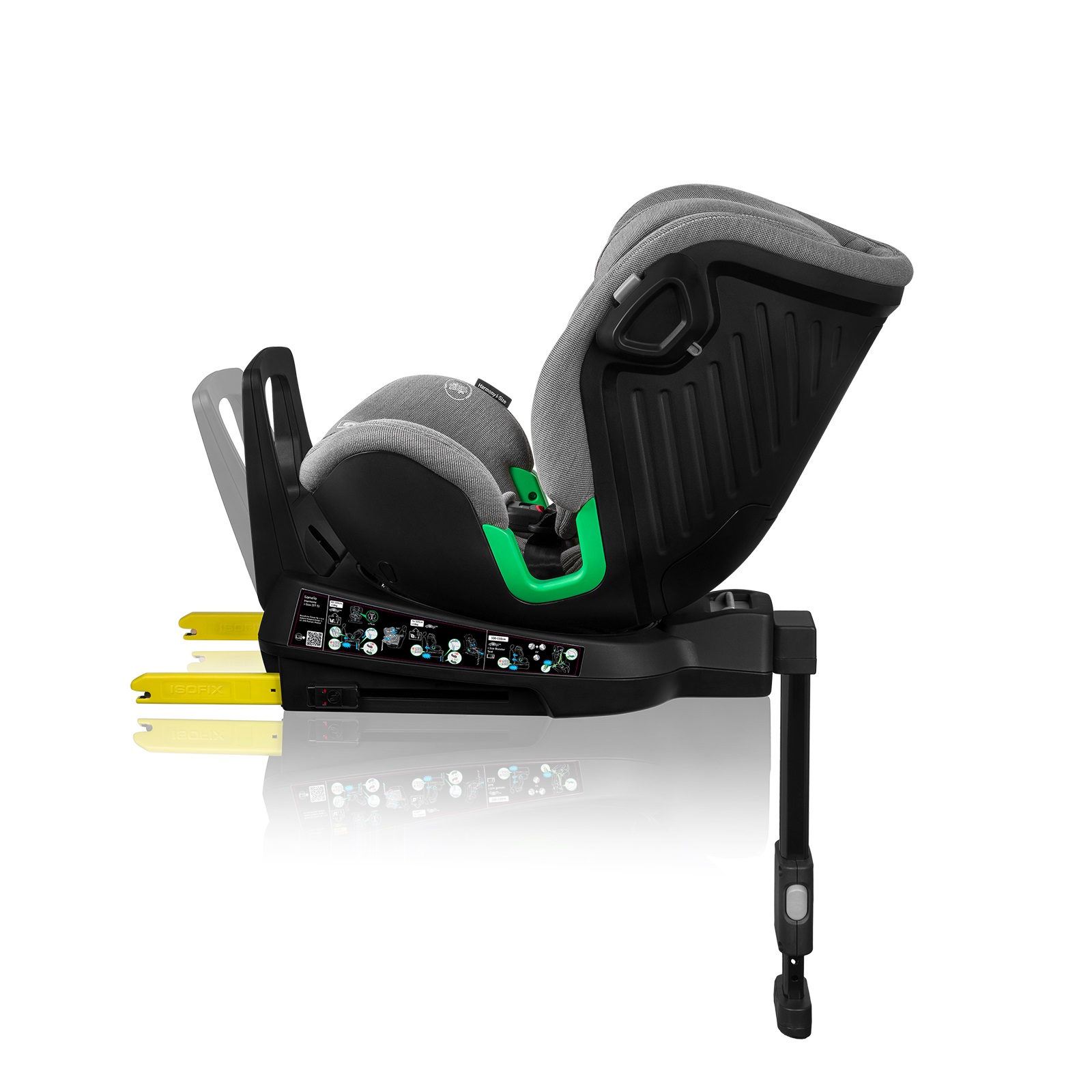 Rama antyrotaycjna nie tylko wpływa na płynne działanie bazy obrotowej, ale również zapewnia dziecku dodatkowe miejsce na nogi. Dzięki możliwości regulacji ramy fotelik znacznie lepiej przylega do kanapy samochodu.