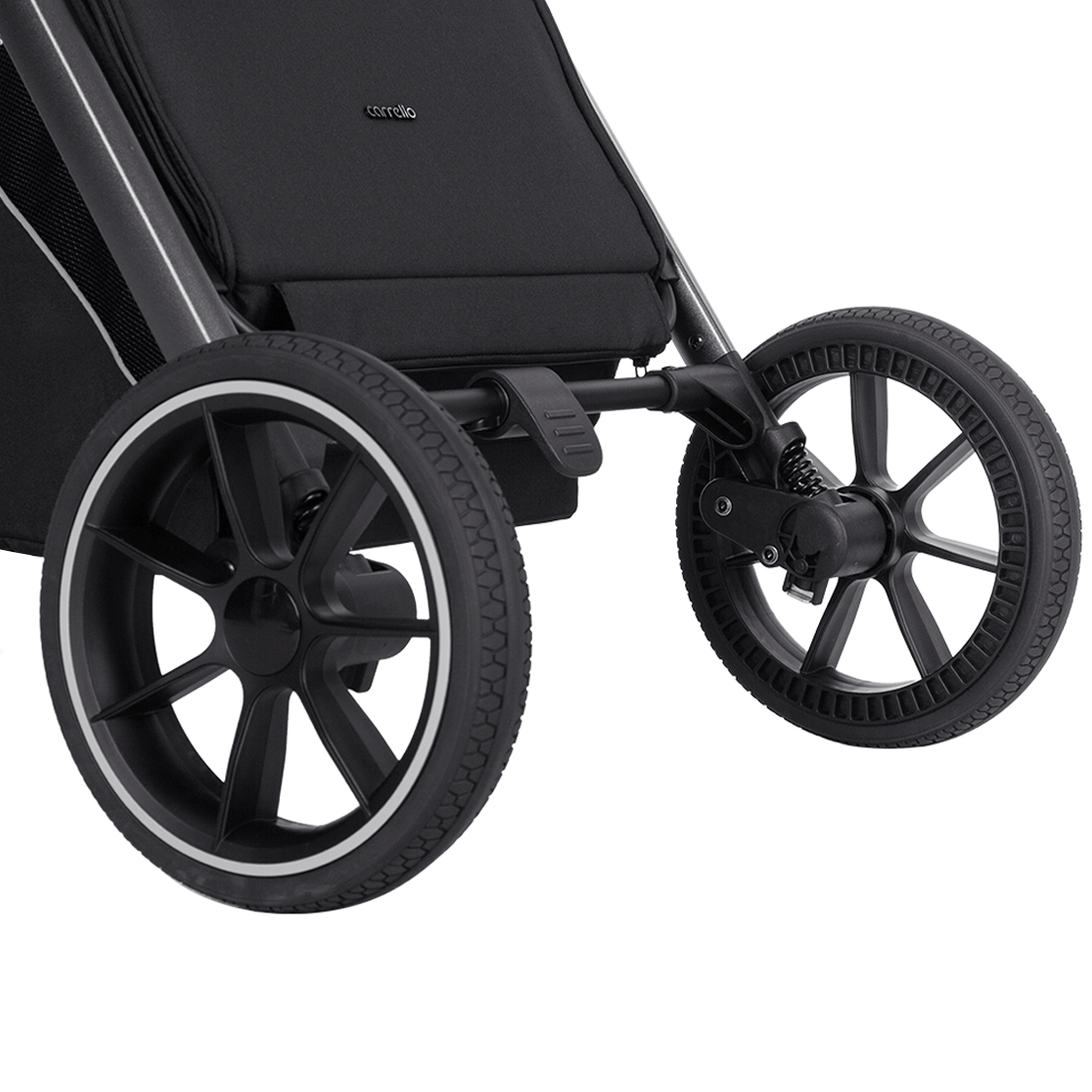 Przednie koła blokują się w pozycji prostej, zapewniając większą mobilność w terenie. Przednie i tylne koła są wyposażone w amortyzację. Wszystkie koła są szybkozłączne.