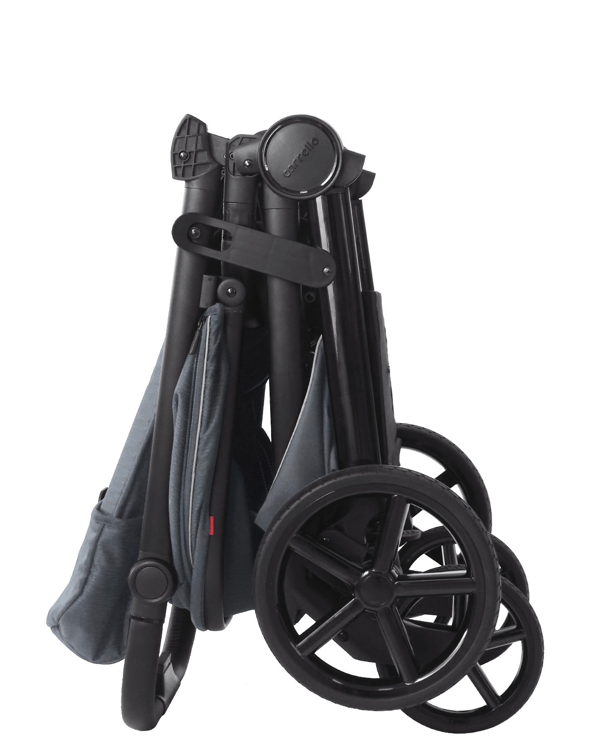 Po złożeniu wózek utrzymuje pozycję pionową i posiada blokadę przed przypadkowym rozłożeniem.