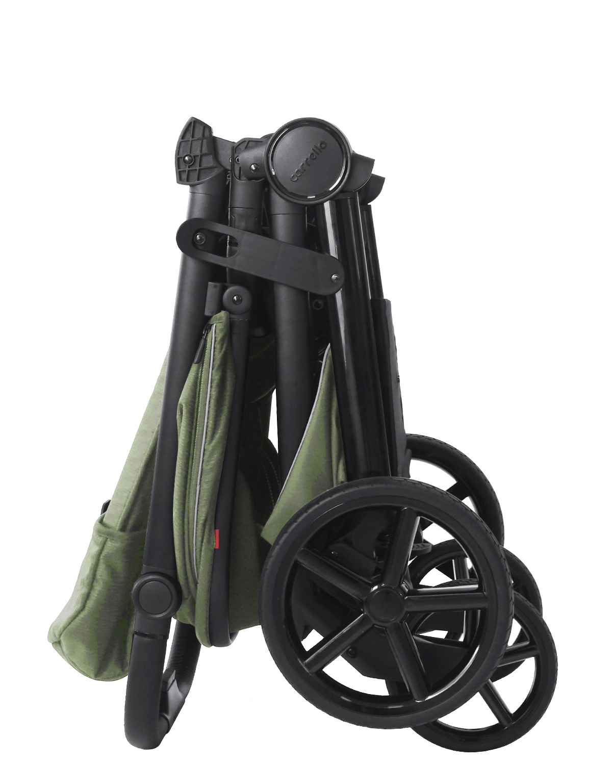 Po złożeniu wózek utrzymuje pozycję pionową i posiada blokadę przed przypadkowym rozłożeniem.