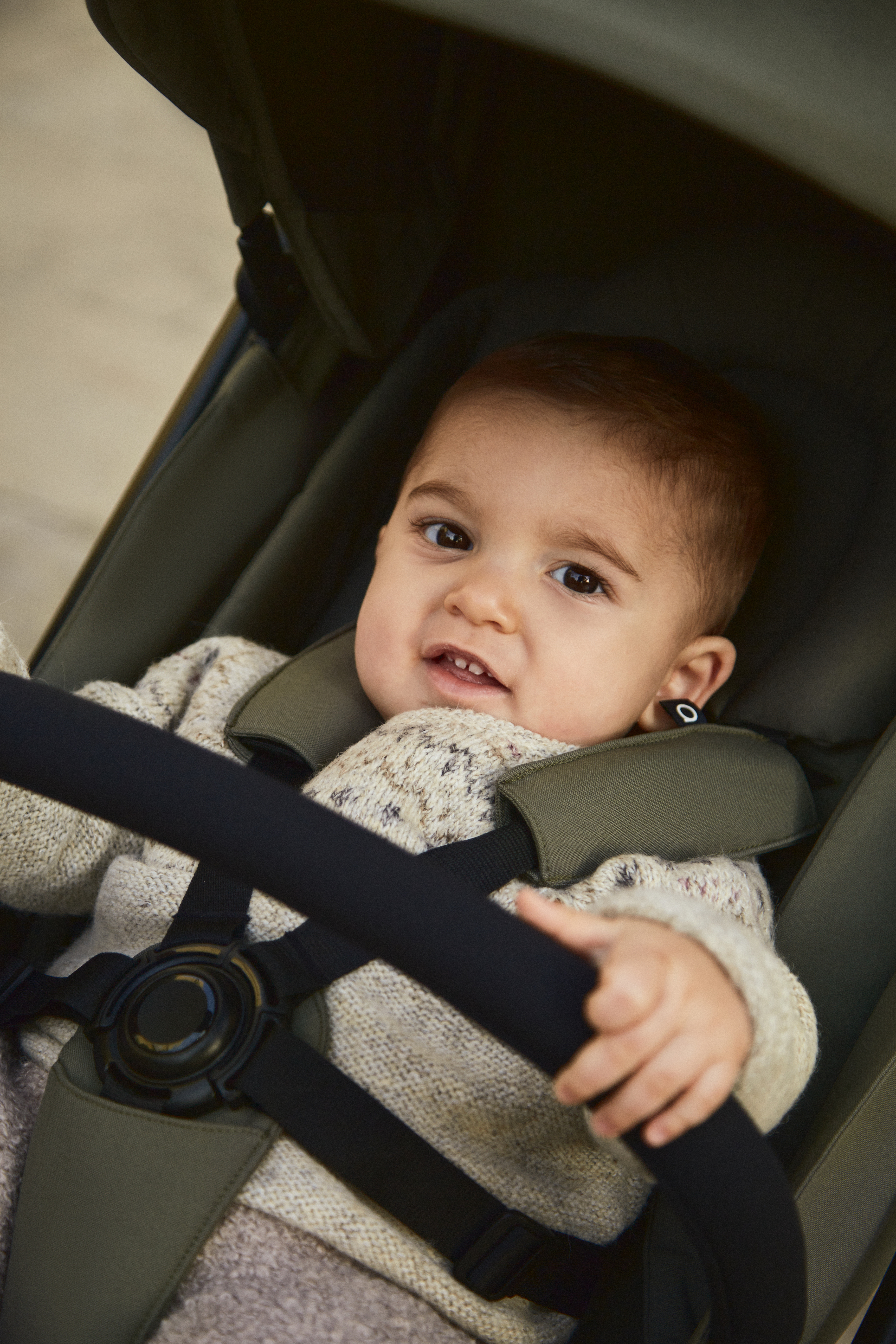 Całe poszycie można w bardzo łatwy sposób ściągnąć i wyprać. Natomiast w samym materiale zastosowano filtr przeciwsłoneczny UPF50+ oraz dodatkowe zabezpieczenie hydrofobowe, które wchłania krople deszczu. Tylną część siedziska możemy swobodnie otworzyć, po to by poprawić wentylację.