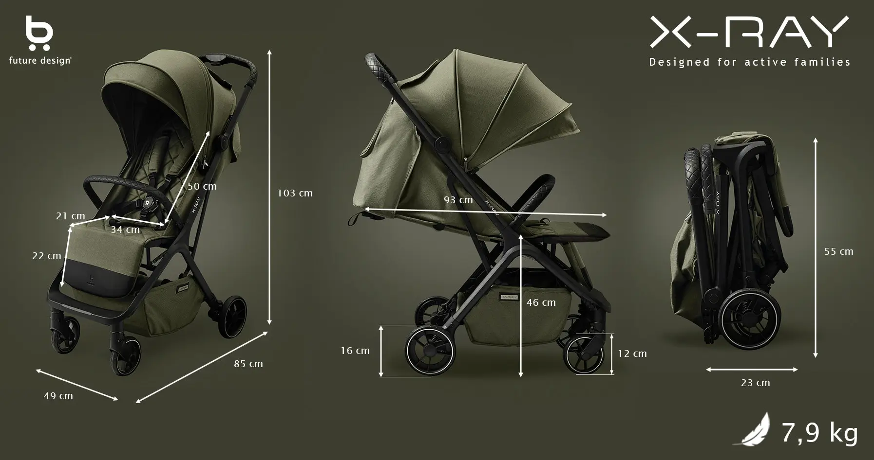 Wózek X-RAY to kompaktowa spacerówka dla aktywnej, nowoczesnej rodziny, idealna na miejskie spacery i podróże. Wyróżnia go styl i gustowne detale. Oferuje nowatorskie rozwiązania, zapewniając komfort i bezpieczeństwo dziecka. Posiada unikalny system automatycznego składania jednym ruchem. Łączy lekką wagę z pełnowymiarowym siedziskiem, z regulacją oparcia i podnóżka od pozycji siedzącej do leżącej.