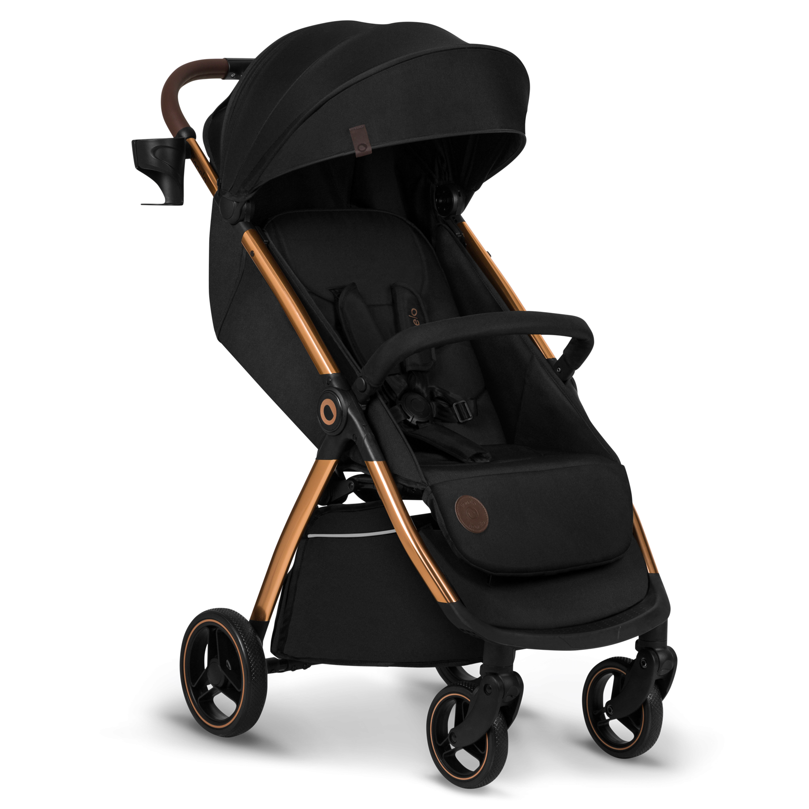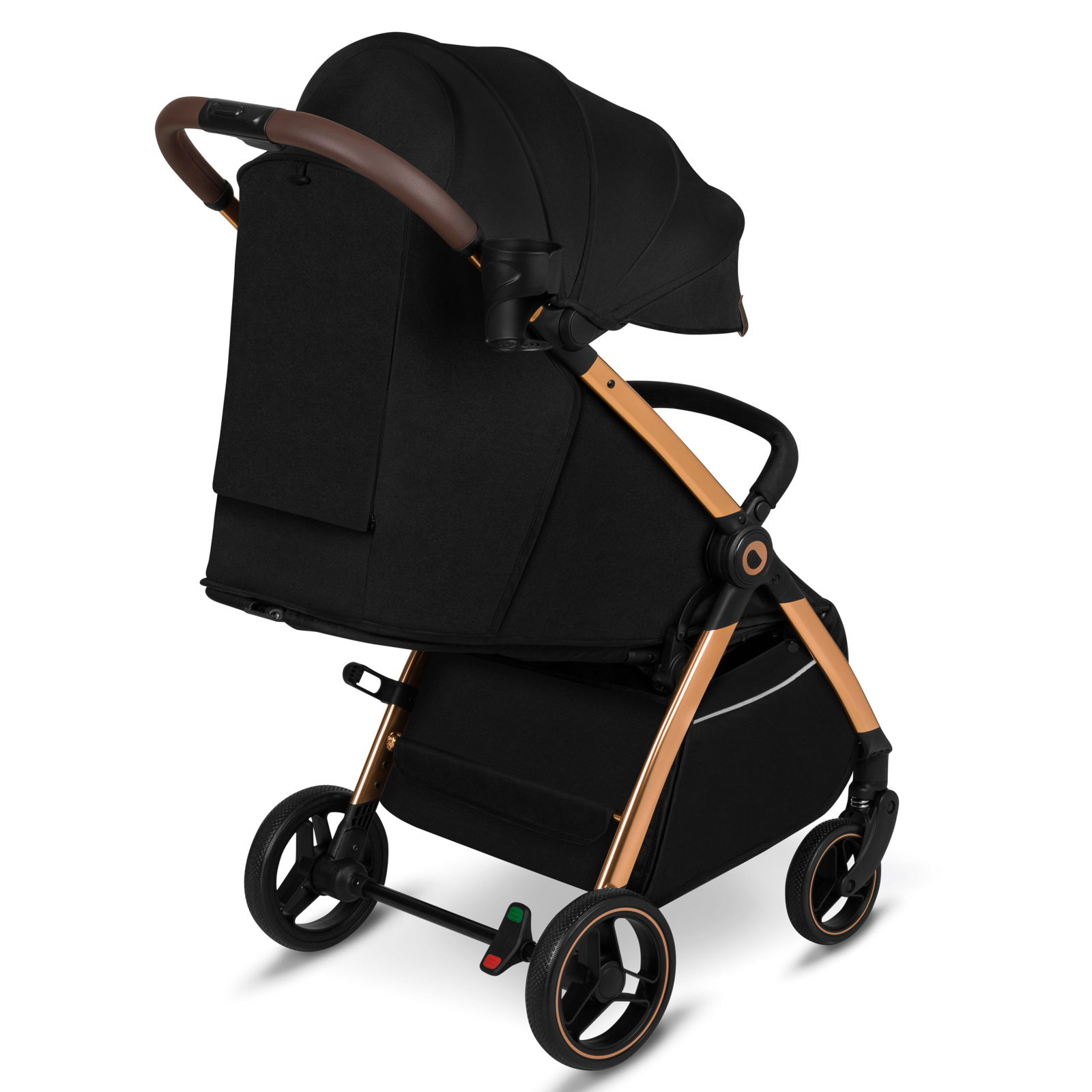 Koła zostały wykonane z pianki EVA, która charakteryzuje się dużą uniwersalnością. Funkcja obrotu 360° sprawia, że wózkiem można z łatwością manewrować. Podwójna amortyzacja – umieszczona zarówno z przodu, jak i z tyłu – zapewnia wygodę nawet podczas pokonywania nierówności. Wózek został wyposażony w centralny hamulec nożny z sygnalizacją.