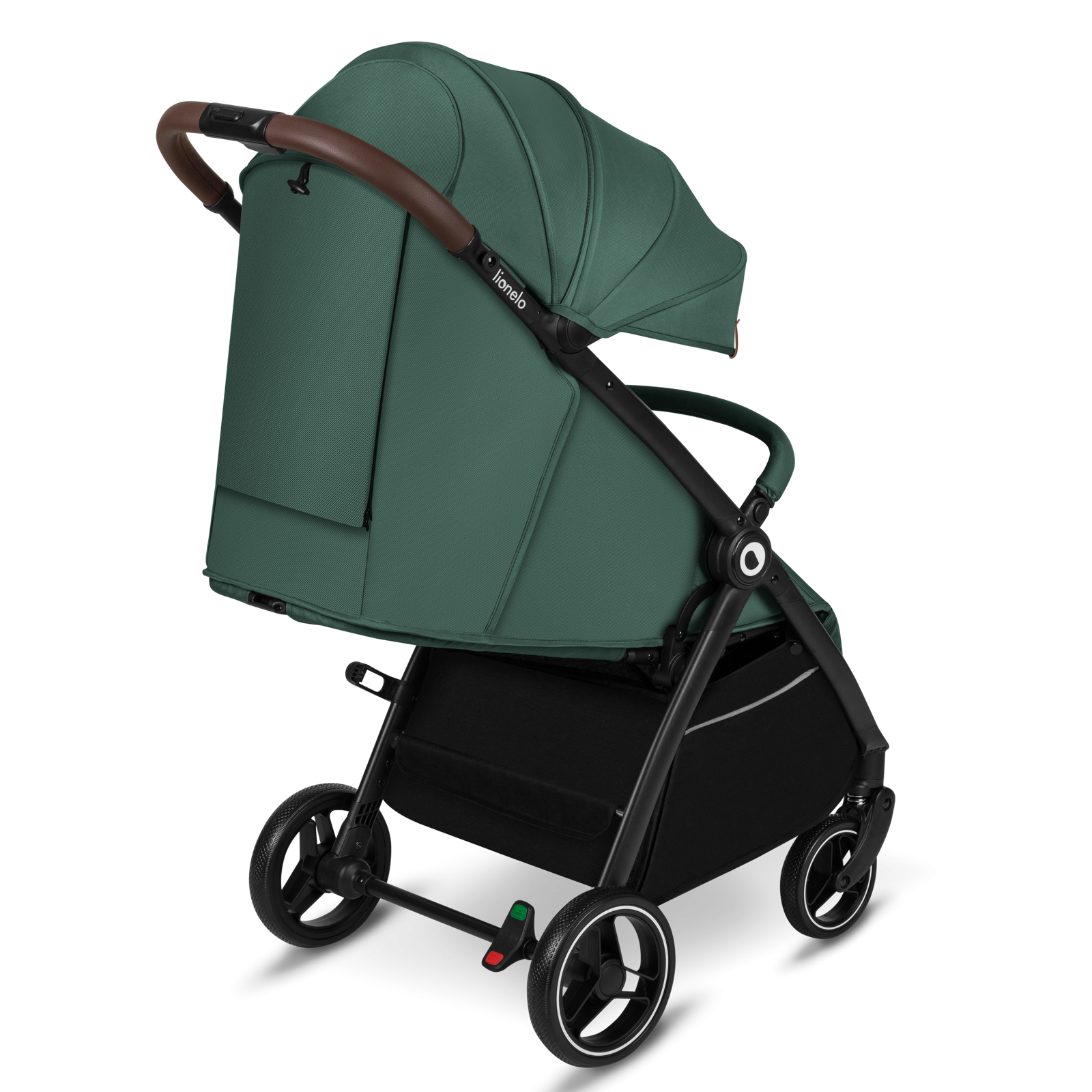 Koła zostały wykonane z pianki EVA, która charakteryzuje się dużą uniwersalnością. Funkcja obrotu 360° sprawia, że wózkiem można z łatwością manewrować. Podwójna amortyzacja – umieszczona zarówno z przodu, jak i z tyłu – zapewnia wygodę nawet podczas pokonywania nierówności. Wózek został wyposażony w centralny hamulec nożny z sygnalizacją.