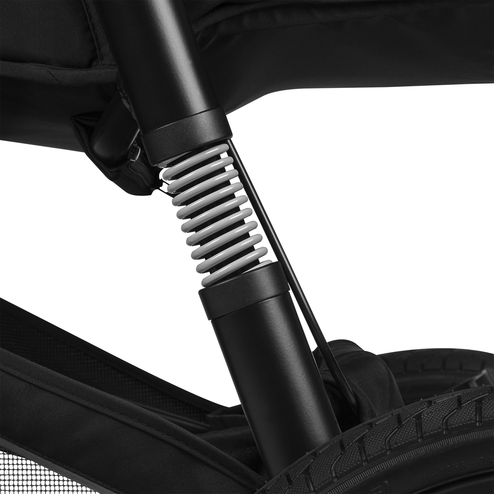 Amortyzacja umieszona zarówno w przednim, jak i tylnych kołach sprawia, że wózek bardzo wygodnie się prowadzi – nawet podczas pokonywania nierówności.