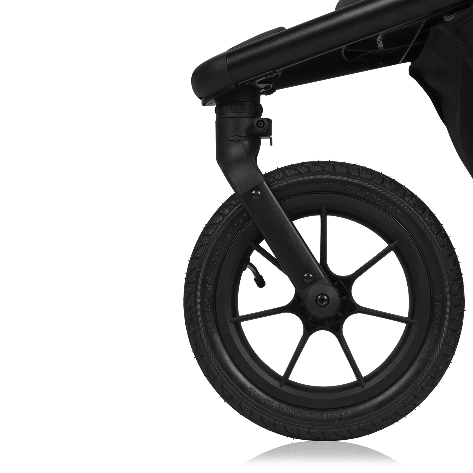 Trzy obszerne (30 i 39 cm), pompowane koła doskonale sprawdzą się podczas jazdy na każdym terenie. Funkcja obrotu 360° z możliwością blokady do jazdy na wprost zapewnia wygodę prowadzenia. Natomiast duża zwrotność pozwala na skuteczne omijanie przeszkód.